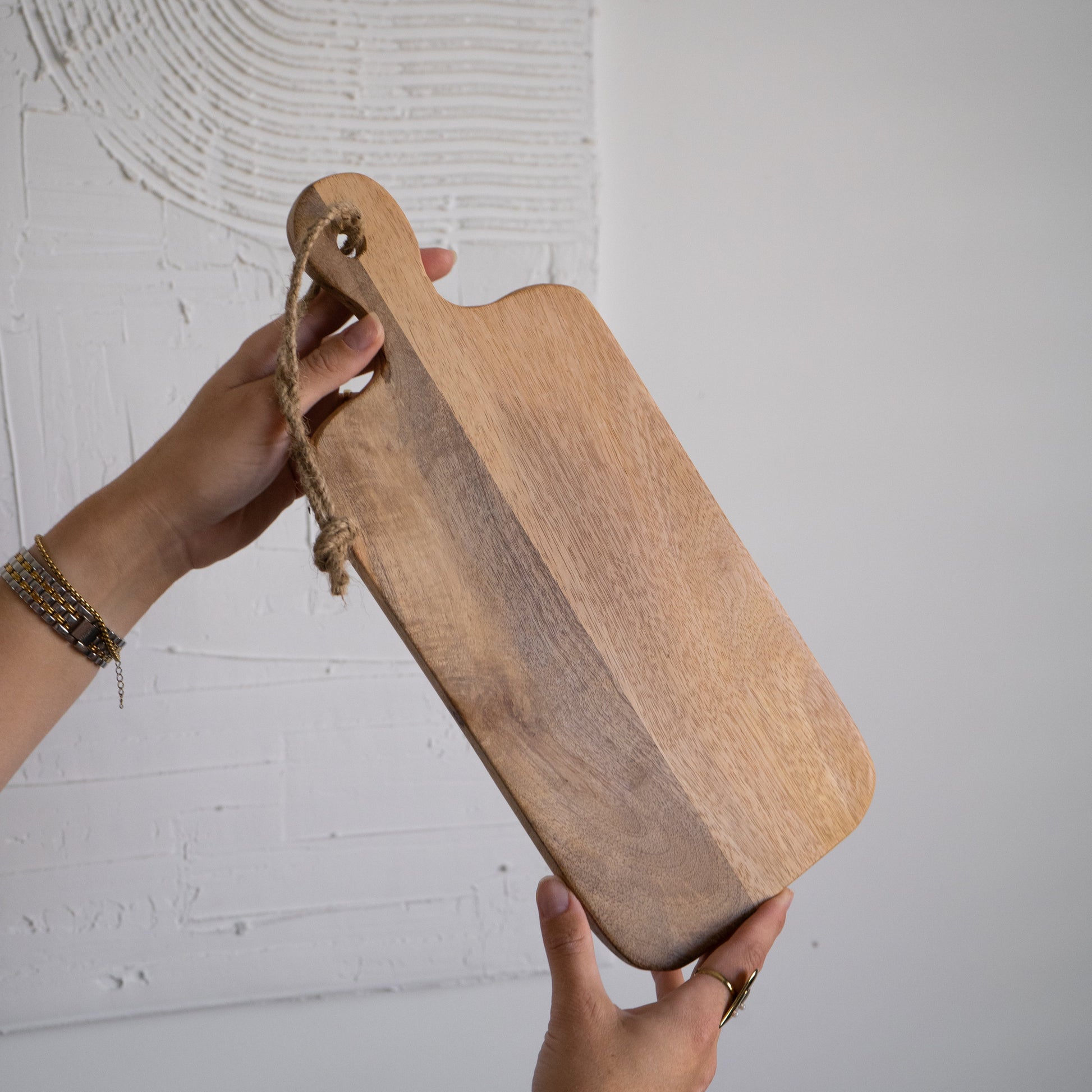 Deze stijlvolle borrelplank is van duurzaam mangohout en voorzien van twee subtiele balkjes aan de onderzijde, waardoor de plank iets verhoogd staat en niet direct op tafel rust. Perfect voor het serveren van hapjes met een elegante presentatie.