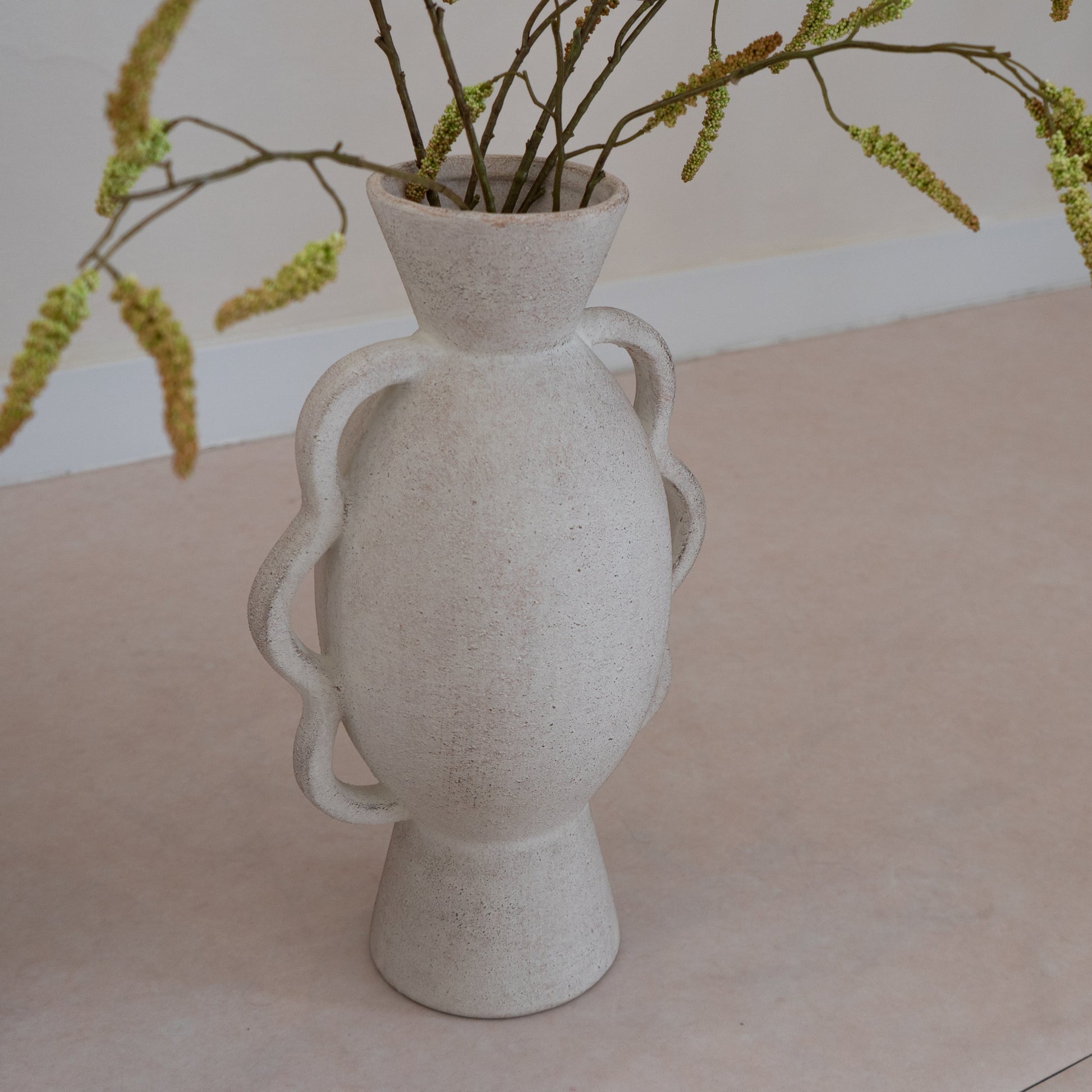 Deze robuuste vaas is een echte blikvanger in je interieur. Met zijn stoere uitstraling en stevige vorm past hij perfect in zowel een moderne als een landelijke stijl. Zet hem neer als los statement piece of vul hem met een paar takken of bloemen voor een compleet geheel.